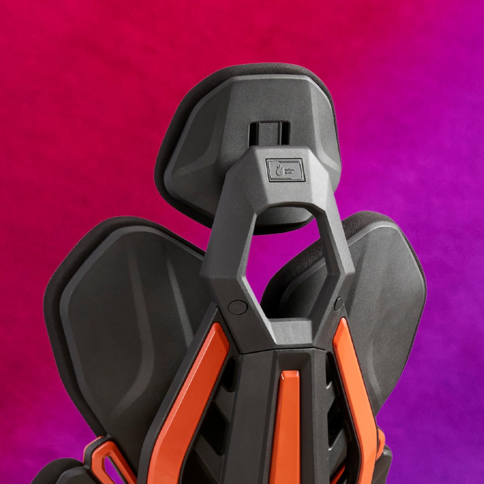 Weiches schwarzes Polster mit orangefarbenen Nähten, umfassende Einstellmöglichkeiten und körpernahe Unterstützung halten dich in jeder Spielsituation konzentriert und unter Kontrolle.